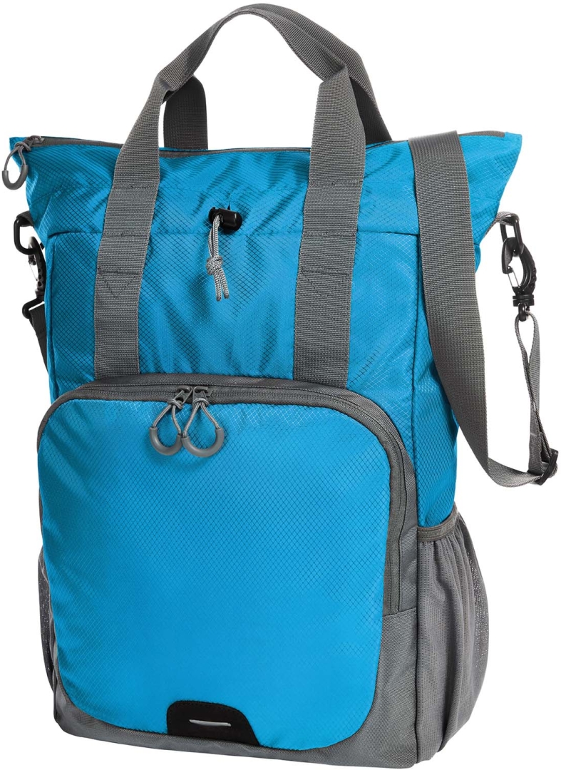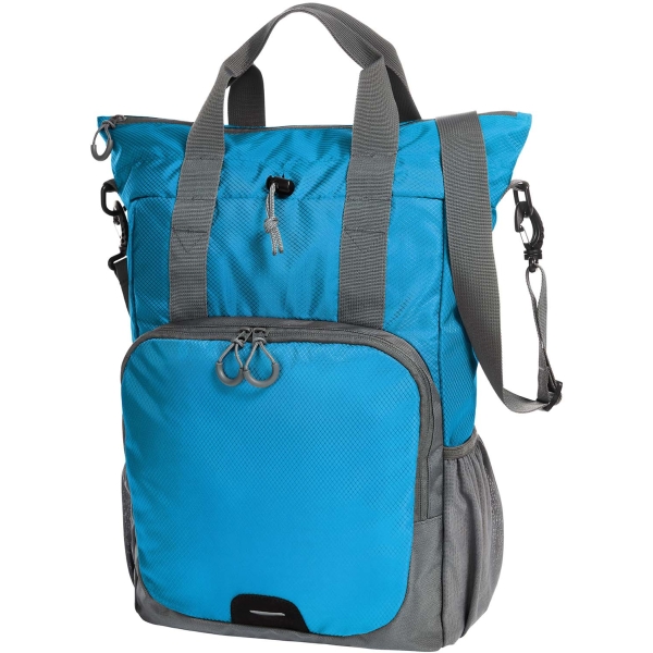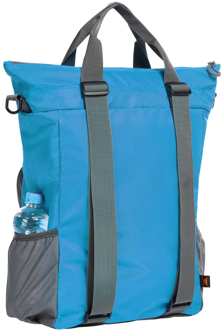 praktická nákupní taška s pěkným tvarem; hlavní úložný prostor se zdrhovadlem a stahovací šňůrou; vnitřní kapsa; přední kapsa se zdrhovadlem se 2 jezdci; funkce batohu s délkově nastavitelnými ramenními popruhy; vpředu reflexní proužky; boční síťka; odnímatelný ramenní popruh s nastavením délky