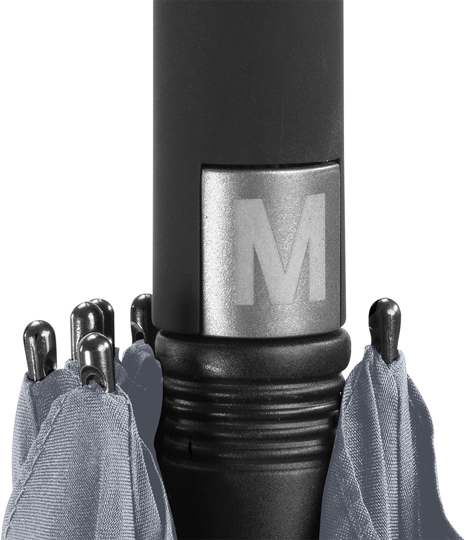 Convenient automatic function for quick opening, high-quality Windproof PLUS system for maximum frame flexibility in stormy conditions, flexible fibreglass ribs, sturdy fibreglass shaft, water and dirt-repellent cover properties through original Teflon™ fabric protector, with waterSAVE® label on the closing strap (with new deliveries), Soft-Touch crook handle with integrated push-button (suitable for laser print), large, accommodating diameter