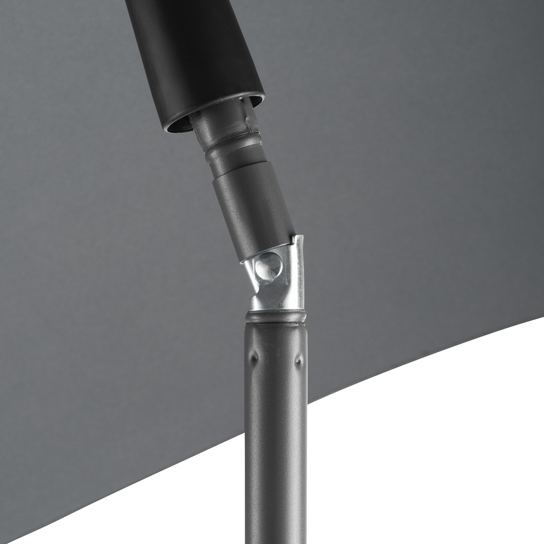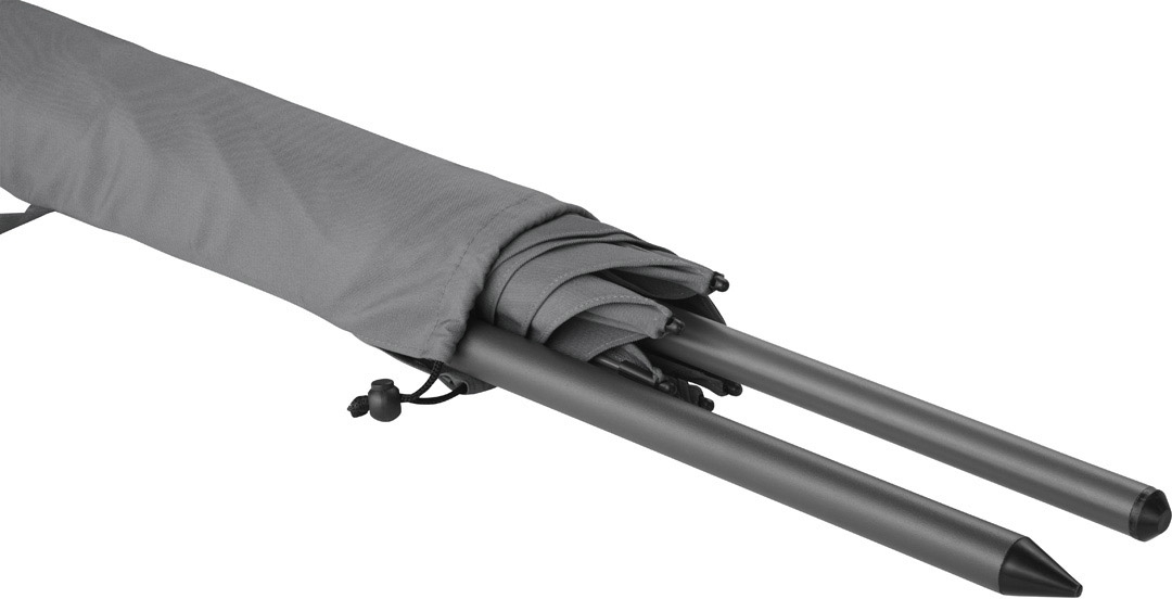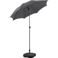 Simple handling with safety runner, solid and sturdy ribs, two-piece and progressively height-adjustable shaft with tilt mechanism to angle the umbrella, ribs and shaft in an elegant titanium finish, lower shaft approx. 120 cm long and twist lock to fix securely, closing strap, convenient carrying case, Cover with sun protection factor UPF 50+, excluding parasol base (Art. 8920 or Art. 8905) / ground spike (Art. 8939)