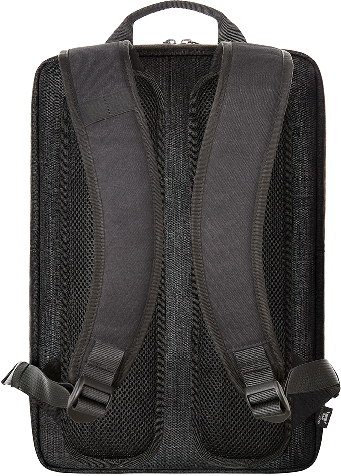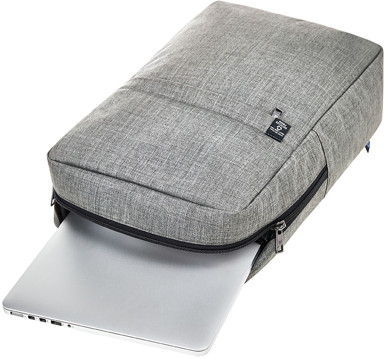 přímočaře zpracovaný batoh; vrchový materiál rPET; velká hlavní kapsa s 2cestným zipem a polstrovanou přihrádkou na notebook; přední kapsa na zip; vypracovaná polstrovaná záda se skrytou kapsou na zip; délkově nastavitelné polstrované ramenní popruhy s pryžovými poutky k upevnění např. slunečních brýlí; držadlo