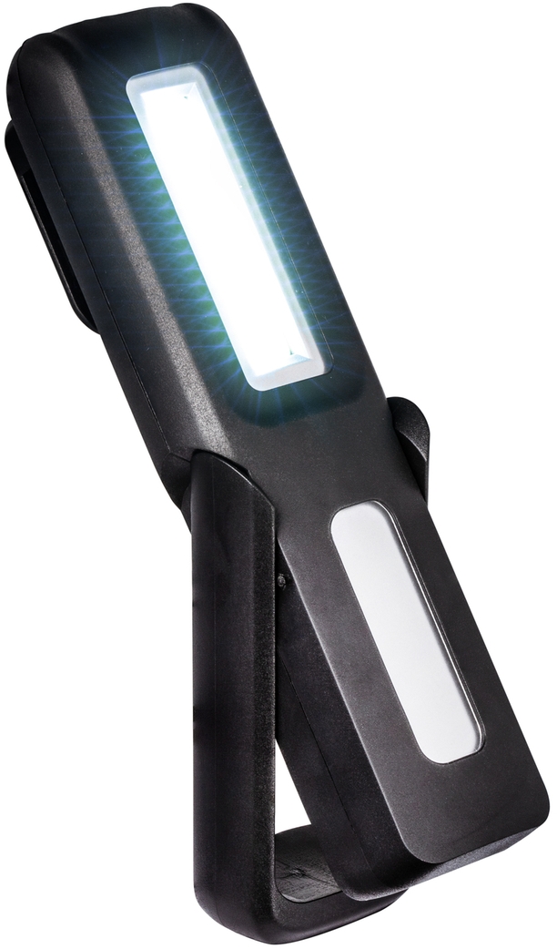 The multifunctional torch for use in the home and in the car has a built-in battery (1200 mA). The charge level indicator shows how much power is still available. It has a lateral COB light (3 watts, 160 lumen) and a front LED light (50 lumen).<br />