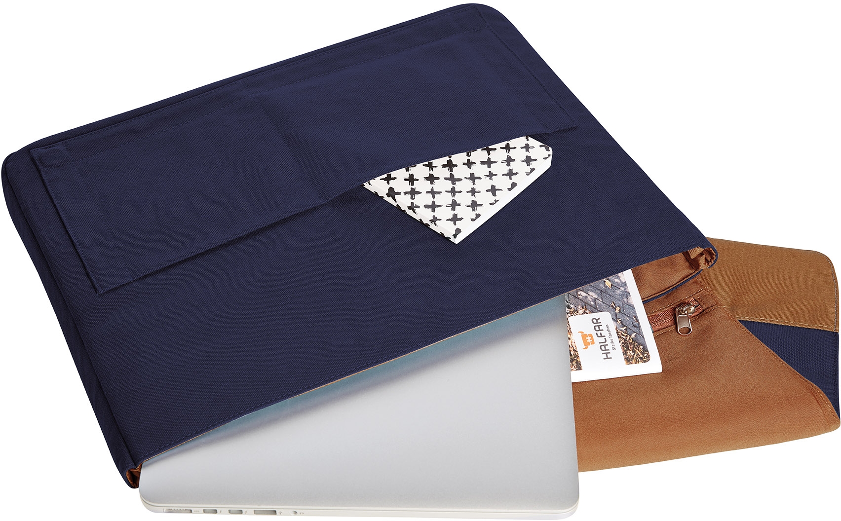 moderní kvalitně zpracované pouzdro na notebook; příjemné uspořádání s bavlněnými aplikacemi s povrchovou úpravou; vhodné na notebook a dokumentaci ve formátu DIN A4; dvě ploché přihrádky na přední straně; přihrádka na zdrhovadlo na chlopni uvnitř; velká přihrádka se zdrhovadlem na zadní straně; zavírání na magnet