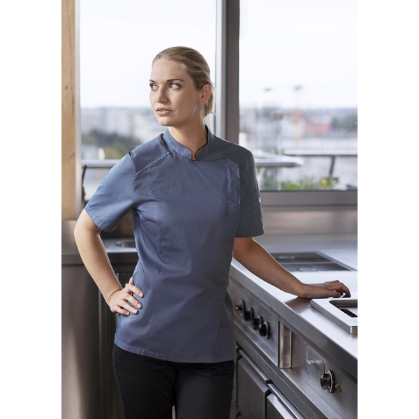 | classy chef jacket for ladies with hidden press stud panel made of very light-weight fabric