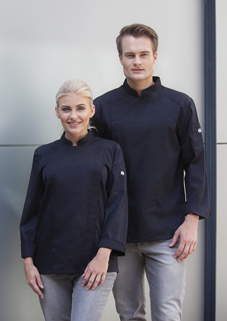 | classy chef jacket with hidden press stud panel made of very light-weight fabric