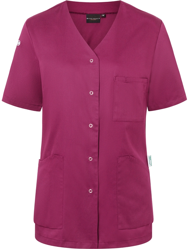 | twill weave, 65% polyester (recycled) / 35% cotton, 150 g/m² | colourfast, easy-care, sustainable | modern, sustainable ladies' tunic with short sleeves and V-neck | polyester content made from recycled plastic | versatile applications in the following areas: medicine, care, wellness, cosmetics, cleaning and much more | especially light fabric for a pleasant wearing comfort in everyday working life | very high washability at 95°C ensures clinical purity | slightly waisted cut | 2 patch side pockets with concealed inner pocket on the right | 1 loop in the side pocket for attaching a key chain | 1 attached breast pocket on the left with pen pocket (at least 11 x 11,5 cm) | 5 central push buttons to close the tunic | matching article: Sleeveless Ladies' Tunic - KS 67 (manufacturers article number) | Global Recycled Standard (GRS): This product is certified according to GRS. It contains 65% GRS recycled polyester and has been produced in an environmentally and socially responsible way. (Certified by Control Union, CU 1091876) | GREEN BUTTON: This product is certified according to the government-run certification label Green Button. This means: high social and ecological standards. A total of 46 stringent social environmental standards must be met. Set by the state and controlled be independent auditors. (Certified by Control Union, CU 1091876) | OEKO-TEX® STANDARD 100: This product has been tested for harmful substances and certified according to OEKO-TEX® STANDARD 100. (Certified by Hohenstein, S22-3027)