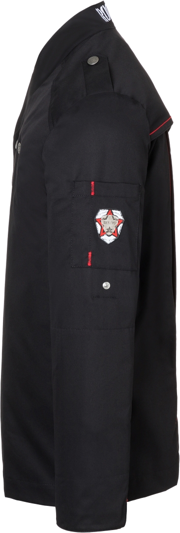 | outer fabric: twill weave, 210 g/m², 100% cotton, pre-shrunk, easy-care, colourfast - lining: twill weave, 140 g/m², 100% cotton, highly refined, pre-shrunk, imprinted | back mesh: 55 g/m², 100% polyester | modern 5-button single breasted jacket with press studs in ROCK CHEF® design | optimum ventilation thanks to rear movement pleats with mesh fabric and sieve eyelets in the armpit area | sleeves can be rolled up and fixed with straps, epaulettes | back yoke | sleeve pocket including pen pocket and logo patch on the left | red contrast stitching, decorative button at the bottom hem | printed lining on the inner sleeves and collar | ROCK CHEF® embroidery on the collar and yoke