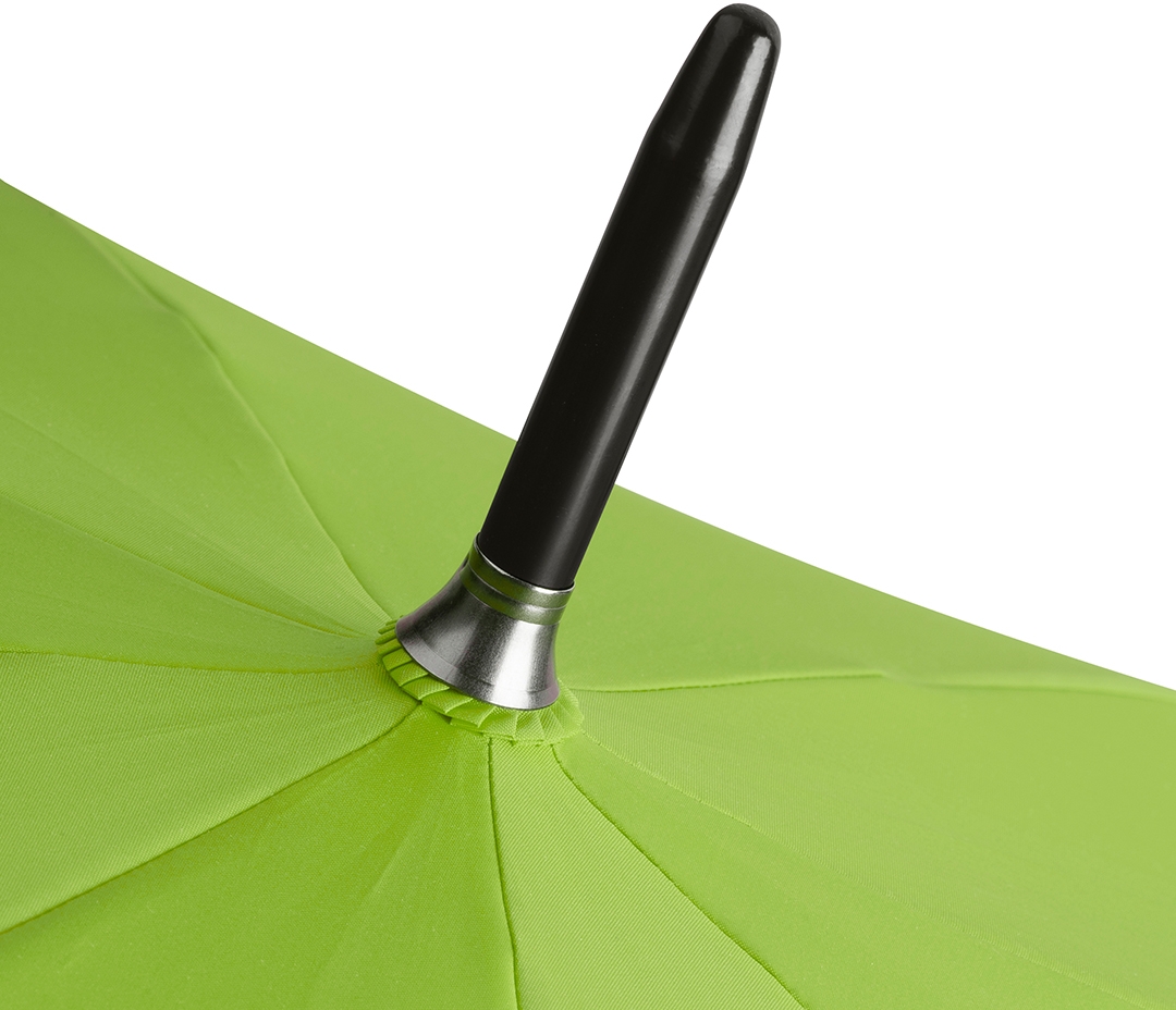 Convenient automatic function for quick opening, Windproof system for higher frame flexibility and stability in windy conditions, flexible fibreglass ribs, water-saving dyed polyester pongee waterSAVE® cover material made of recycled plastics, with waterSAVE® label on the closing strap, genuine wood tips, crook handle made of genuine wood, higher corrosion protection due to black galvanised steel shaft