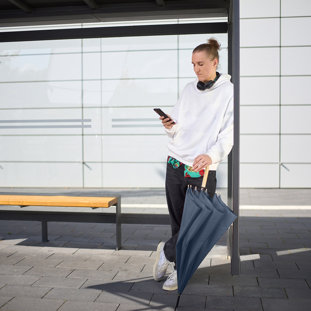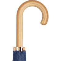 Convenient automatic function for quick opening, Windproof system for higher frame flexibility and stability in windy conditions, flexible fibreglass ribs, water-saving dyed polyester pongee waterSAVE® cover material made of recycled plastics, with waterSAVE® label on the closing strap, genuine wood tips, crook handle made of genuine wood, higher corrosion protection due to black galvanised steel shaft