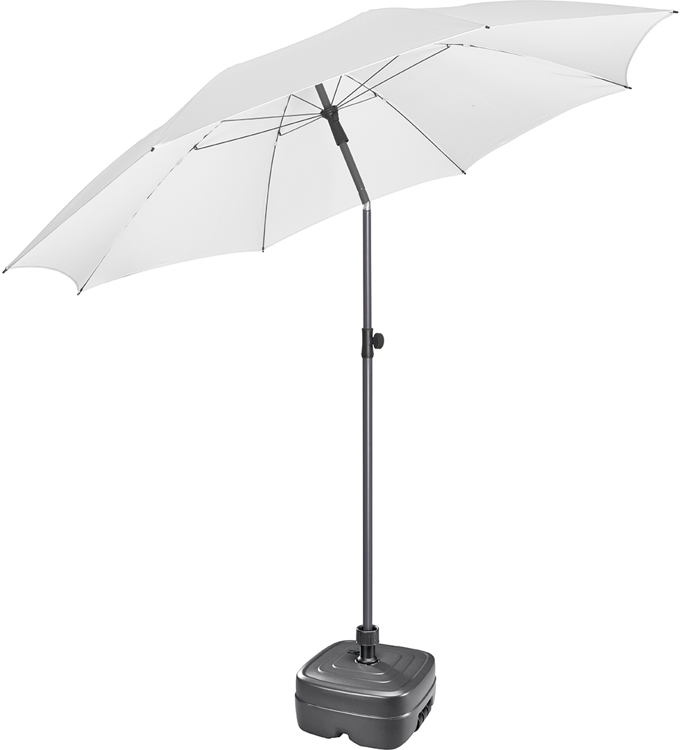 Simple handling with safety runner, very solid fibreglass ribs, two-piece and progressively height-adjustable shaft with with tilt mechanism to angle the umbrella, shaft in an elegant titanium finish, lower shaft approx. 125 cm long and twist lock to fix securely, convenient carrying case, high-quality cover with a grammage of approx. 200 g/m² and UPF 50+ sun protection factor, overlapping ventilation cover to regulate pressure in stronger gusts, excluding parasol base (art. 8920)