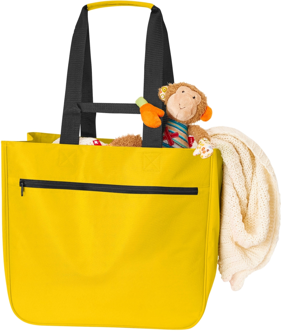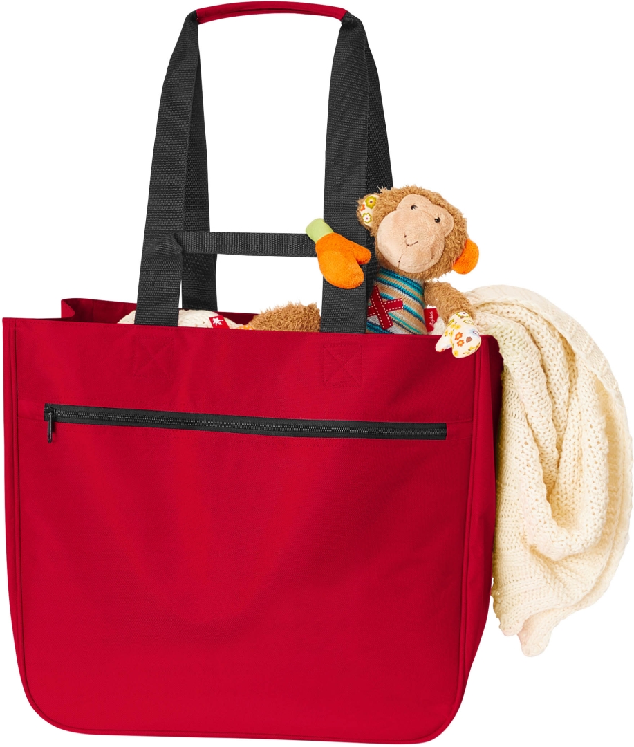 Flexibilní, prostorná nákupní taška pro mnohostranné použití, velká hlavní přihrádka s nožičkami na dně; přední kapsa na zip; systém přenášení s dvojitými uchy a polstrovaná manžeta pro nejlepší pohodlí při přenášení