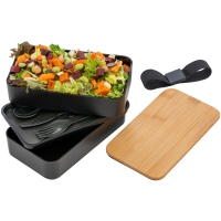 The lunch box made of BPA-free plastic contains two black 500 ml containers that are separated by a divider. Inside the separator is a black plastic cutlery set consisting of a knife, fork and spoon. To ensure that the cutlery is safely stowed away, the individual pieces of cutlery are clamped in matching holders. A food separator for one of the two boxes is also included. <br />