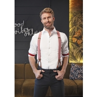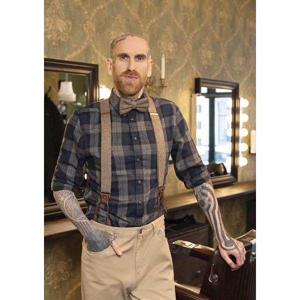 | fastening to trousers either with genuine leather loops for buttoning (set of buttons not included) or with clips in antique brass for quick and easy fastening