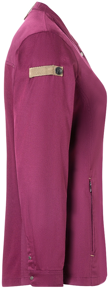 | front section: twill weave, 65% polyester (recycled) / 35% cotton, 150 g/m² | back section: jersey piqué, 100% polyester (recycled), 170 g/m², breathable, moisture-regulating | innovative sustainable chef jacket for ladies that combines urban style with natural flair | polyester content made from recycled plastic | slightly tapered cut | jersey-piqué back insert provides pleasant ventilation and increased freedom of movement | with press studs for quick opening and closing | sleeve cuffs with with press studs | front part with zipped pockets and welt pocket on the left sleeve (6 x 1 cm) | stylish use of contrasting ribbons on the sleeves and neck for a urban look | matching article: Chef Jacket Green-Generation - JM 35 (manufacturers article number) | Global Recycled Standard (GRS): This product is certified according to GRS. It contains 72% GRS recycled polyester and has been produced in an environmentally and socially responsible way. (Certified by Control Union, CU 1091876) | GREEN BUTTON: This product is certified according to the government-run certification label Green Button. This means: high social and ecological standards. A total of 46 stringent social environmental standards must be met. Set by the state and controlled be independent auditors. (Certified by Control Union, CU 1091876) | OEKO-TEX® STANDARD 100: This product has been tested for harmful substances and certified according to OEKO-TEX® STANDARD 100. (Certified by Hohenstein, S22-3027)