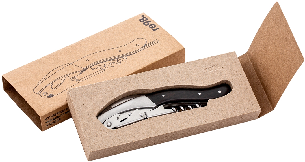 The premium RE98-CORXX sommelier knife is crafted from recycled stainless steel and features a sturdy and comfortable wooden handle. It combines three tools in one: a corkscrew, a bottle opener, and a foil cutter with a serrated edge. Owing to its two-step double-lift mechanism, any cork can be smoothly and effortlessly removed from any bottle type. All tools fold away seamlessly for compact storage.<br />