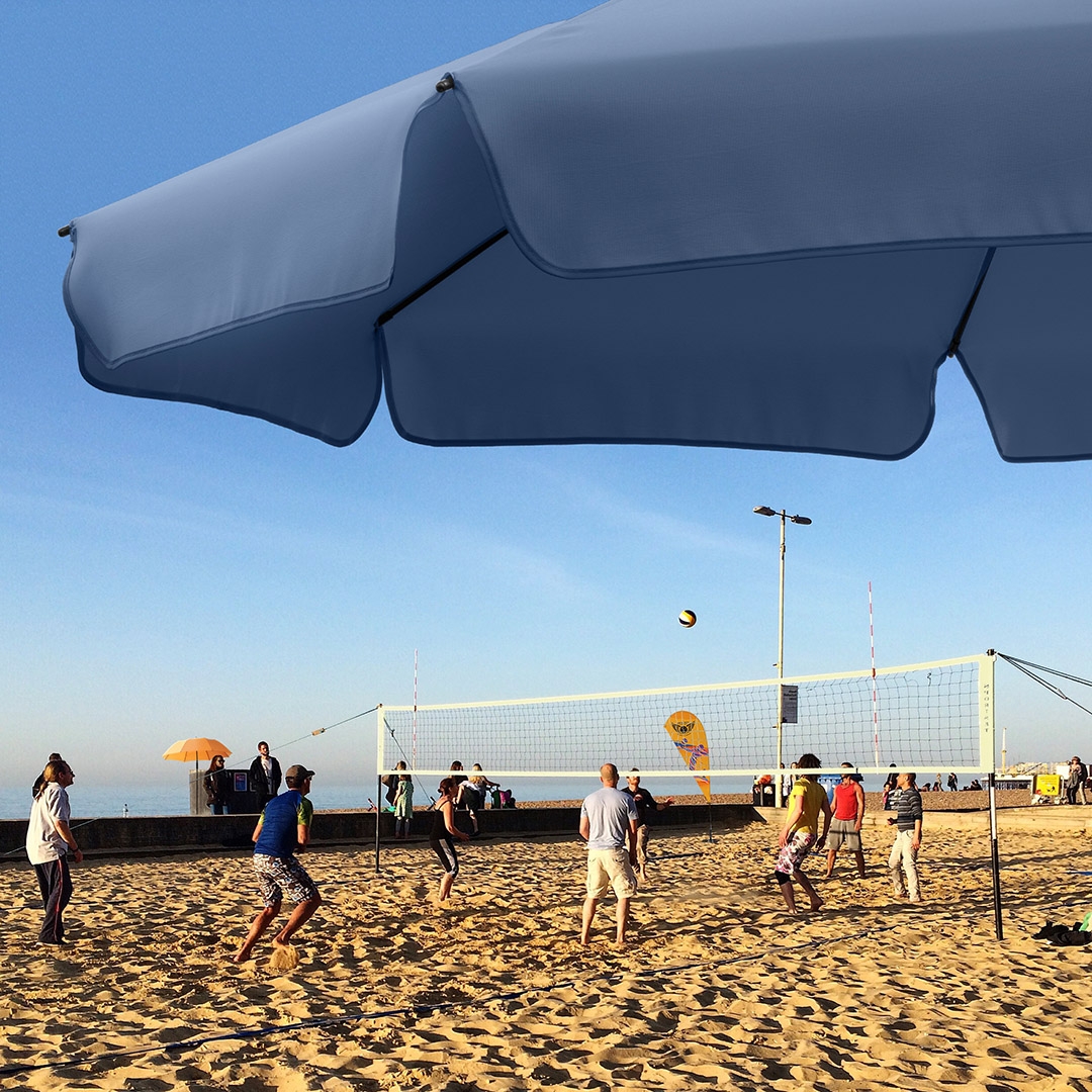 Easy handling thanks to safety runner, very robust fibreglass ribs, two-part and infinitely height-adjustable shaft with tilt mechanism for tilting the umbrella, shaft in elegant titanium finish, lower shaft with approx. 120 cm length and twist lock for secure fixing, comfortable carrying case, cover with UPF 50+ sun protection factor, cut volant, exclusive parasol base (Art. 8920 or Art. 8905) / ground spike (Art. 8939)