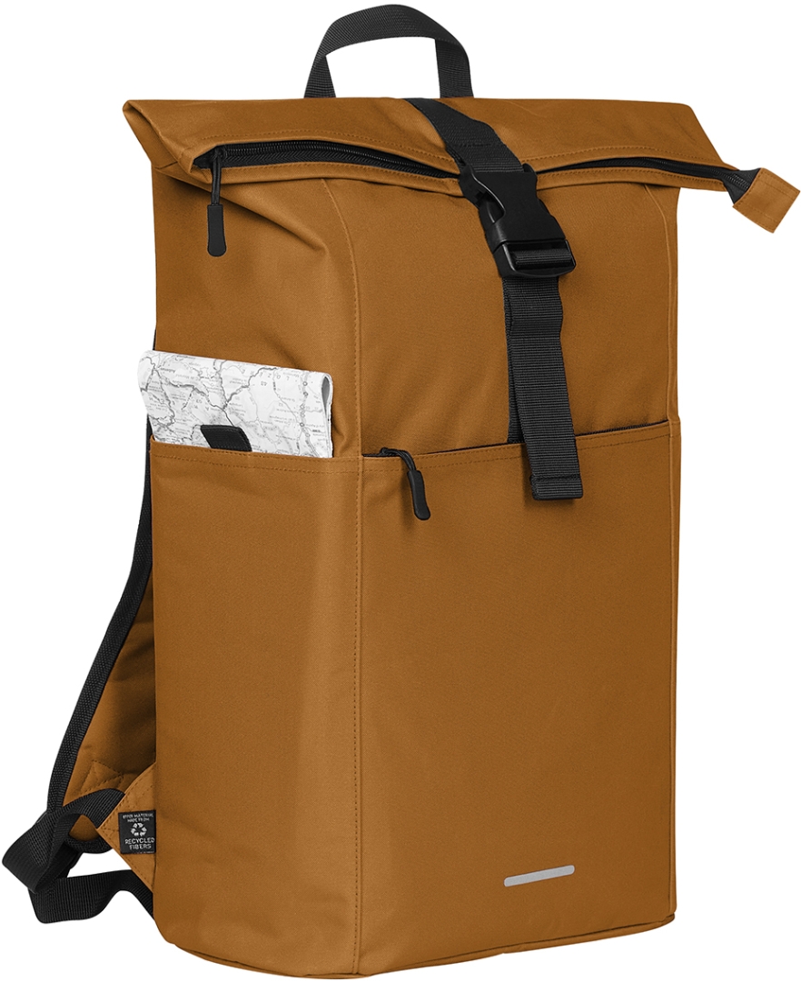 praktický rolovací batoh, recyklovaná vnější tkanina, velká hlavní přihrádka na zip a přídavné zapínání, atraktivní reflexní potisk, vnější materiál RPT, velká polstrovaná kapsa, kapsička na airtag, vpředu velká přední kapsa na zip, dvě boční kapsy, např. na láhev s vodou, polstrovaný nosný systém, madlo