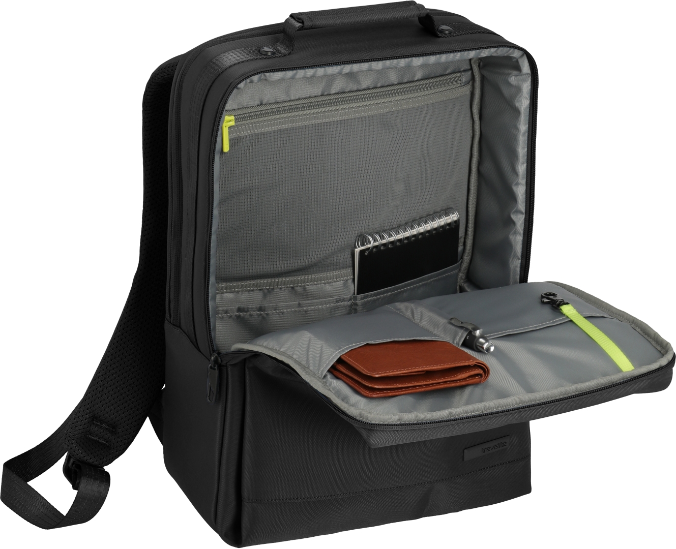 - Carrying handle on the side - Zippered compartment - Attachment function - Padded back panel - Adjustable, padded shoulder straps with adjustable chest strap - One main compartment with slip and zipper compartments - Hidden security compartment on the back - Hook-on zipper for extra security - 17” laptop compartment - Extra mesh compartment for cables - Pendant for keys