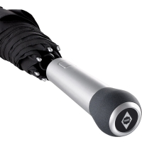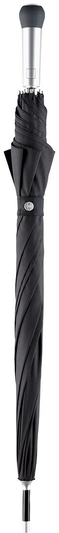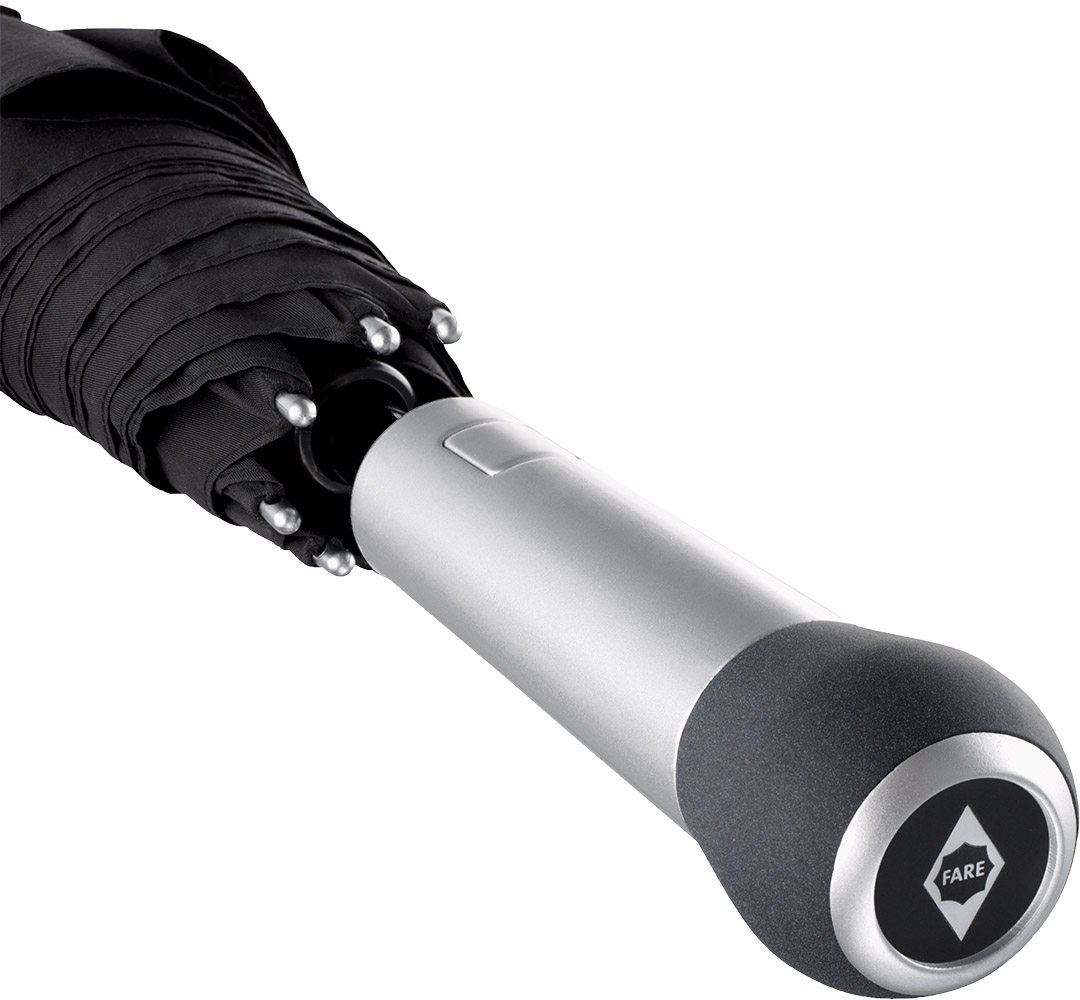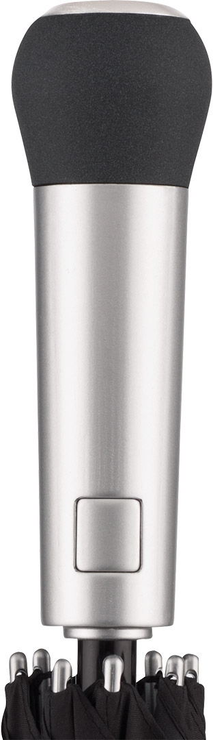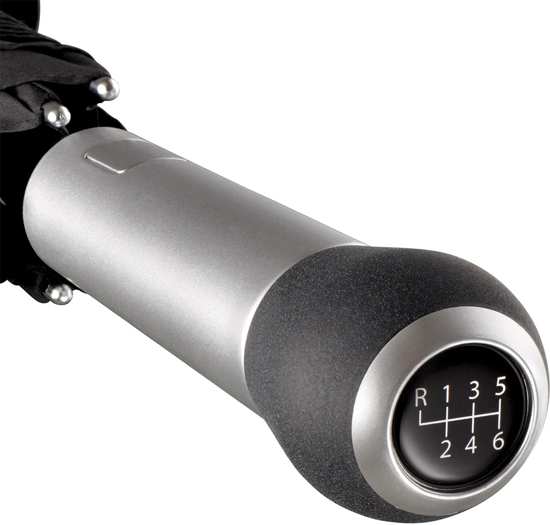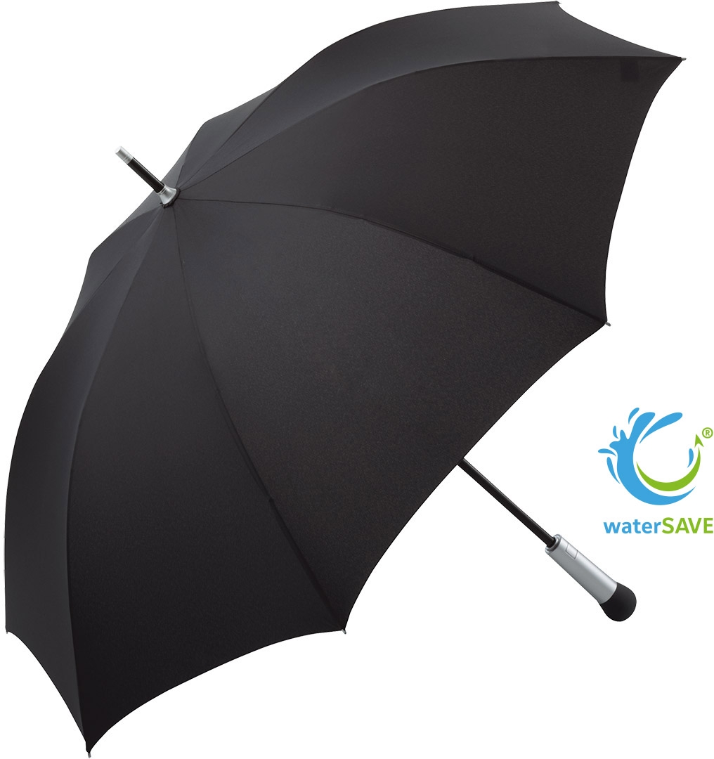 Convenient automatic function for a quick opening, high-quality Windproof PLUS system for maximum frame flexibility in stormy conditions, flexible fibreglass ribs, water-saving coloured polyester pongee waterSAVE® cover material made from recycled plastics, with waterSAVE® label on the closing strap, dull silver gear stick handle with promotional labelling option (f. e. shifting gate), handle with special finish parts and integrated push button, higher corrosion protection due to galvanized steel shaft. Also available as mini umbrella (art. 5655).