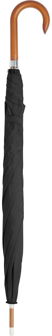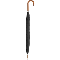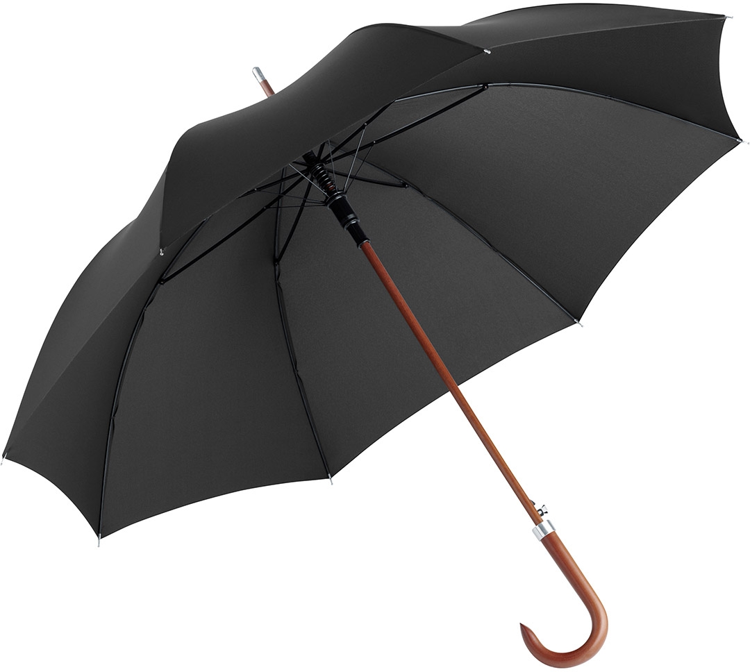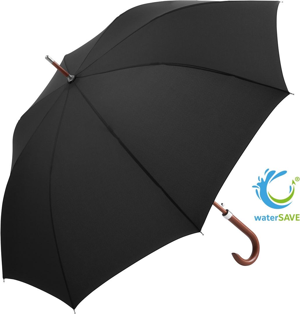 Convenient automatic function for quick opening, Windproof system for higher frame flexibility and stability in windy conditions, flexible fibreglass ribs, shaft made of genuine wood in dark brown colour, water-saving coloured polyester pongee waterSAVE® cover material made from recycled plastics, with waterSAVE® label on the closing strap, elegant crook handle made of genuine wood, large, accommodating diameter