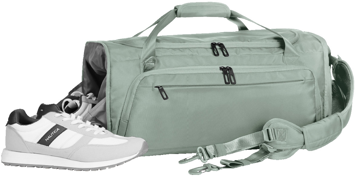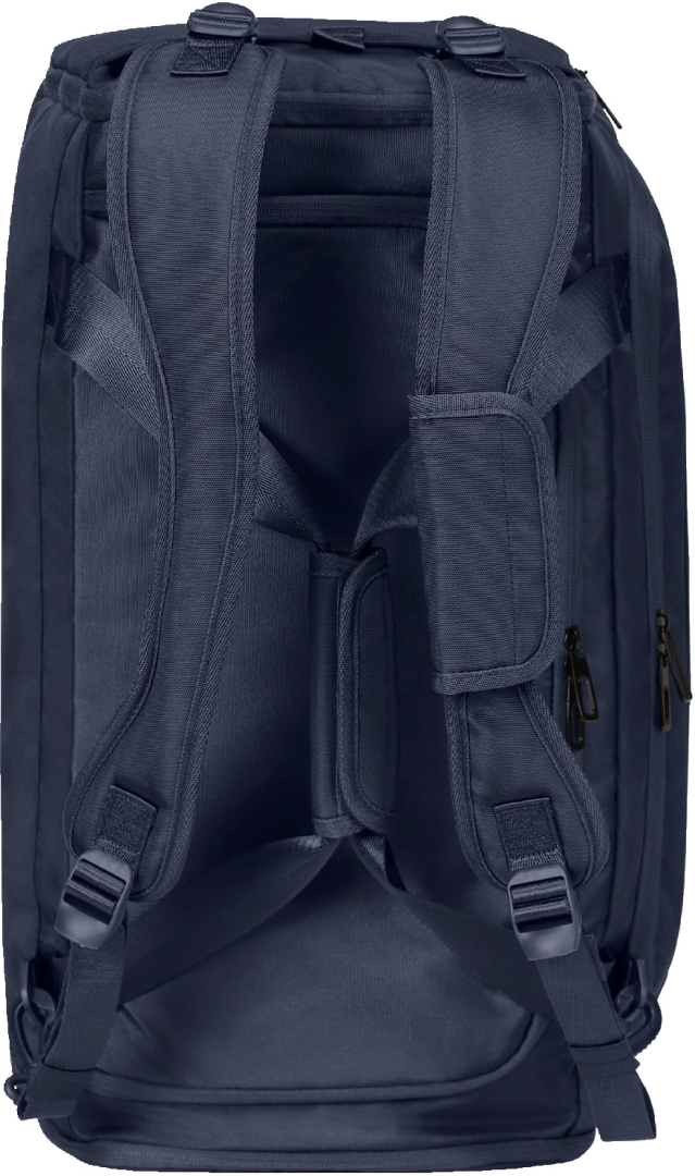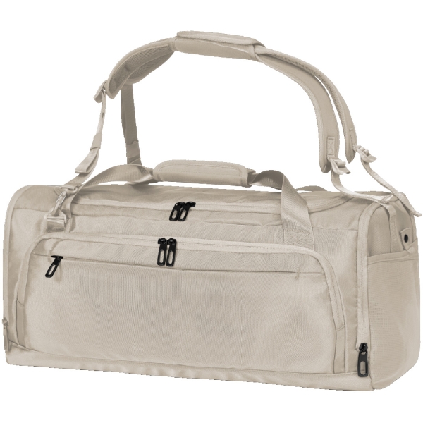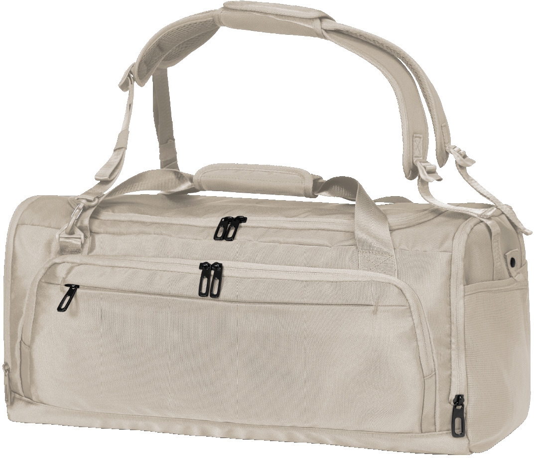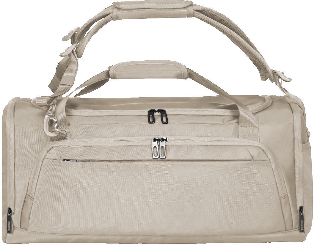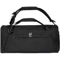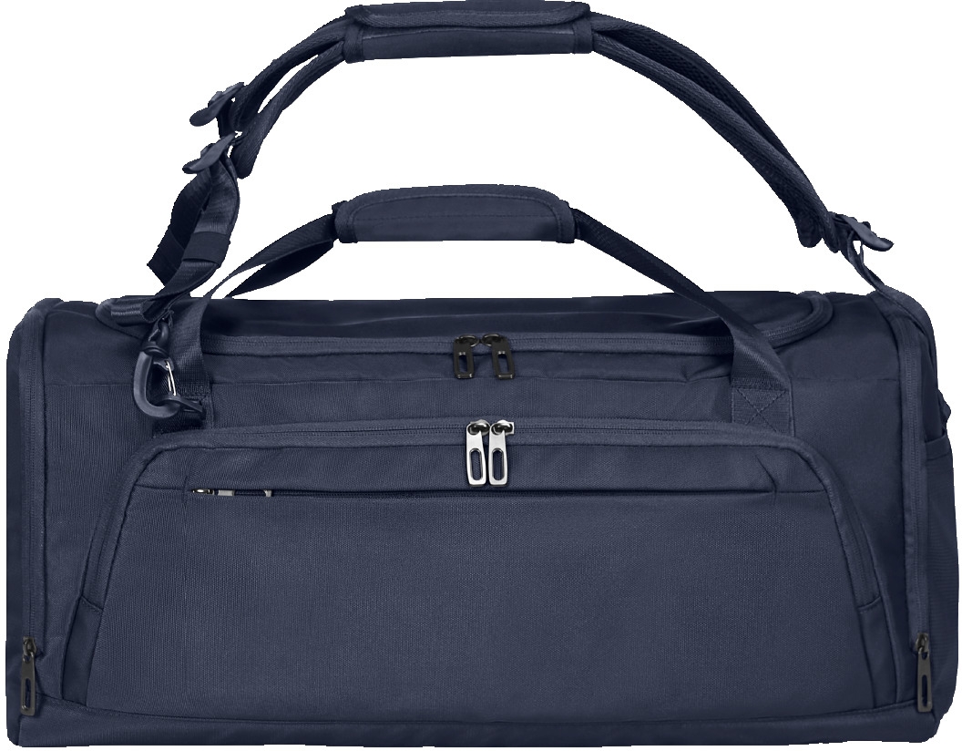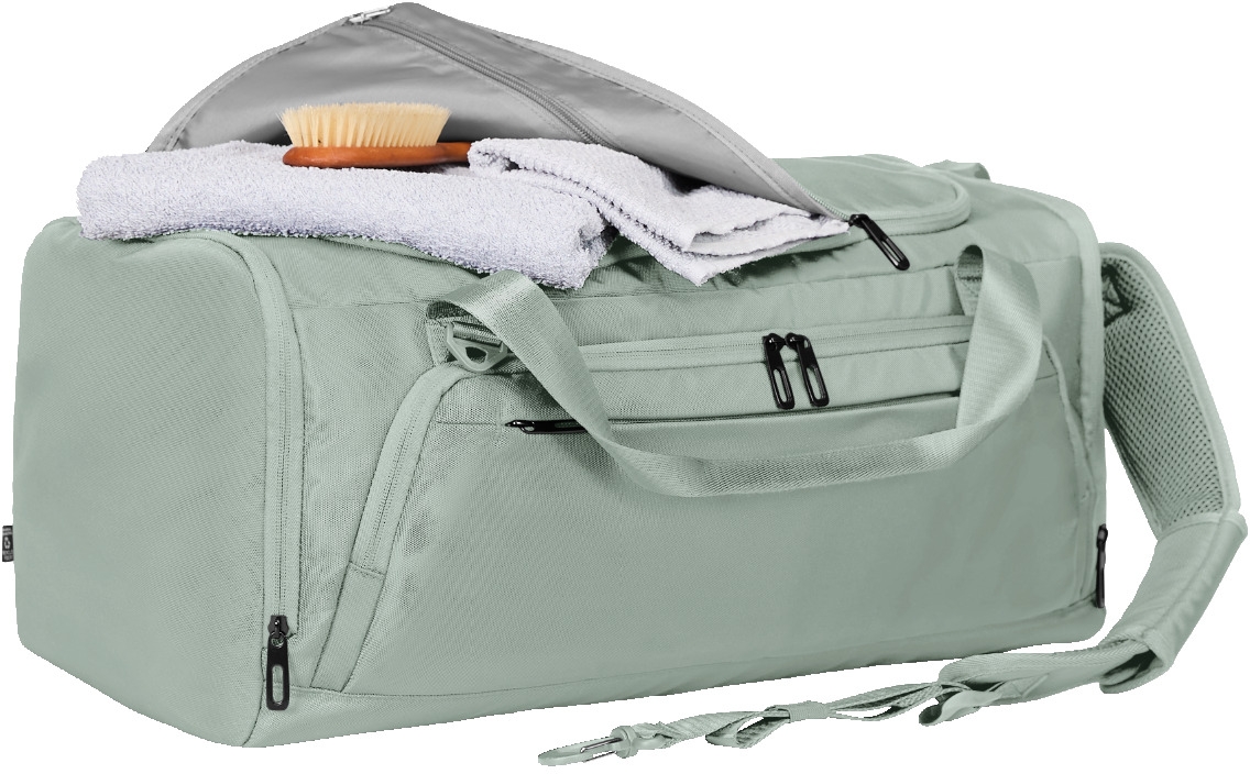 komfortni sportovní a cestovní taška s funkcí batohu; recyklovaná tkanina; velký hlavní prostor s dvoucestným zipem; boční kapsa na zip včetně sáčku na boty; přední část: velká přední kapsa s dvoucestným zipem a plochá kapsa na zip; uvnitř: závěsný organizér na zip a prostorná kapsa na zip ve víku; polstrované dno; boční síťovaná kapsa pro uložení nastavitelných, odnímatelných a polstrovaných ramenních popruhů – ergonomicky tvarovaných a použitelných jako batoh nebo ramenní popruh; rukojet z polstrovanou manžetou