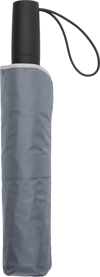 Easy to handle thanks to sliding safety runner, high-quality Windproof PLUS system for maximum frame flexibility in stormy conditions, special umbrella shape through 10 panels, cover with trendy reflective piping in silver, comfortable Soft-Feel handle with elastic loop and promotional labelling option, generous diameter, sleeve with trendy reflective piping.