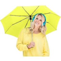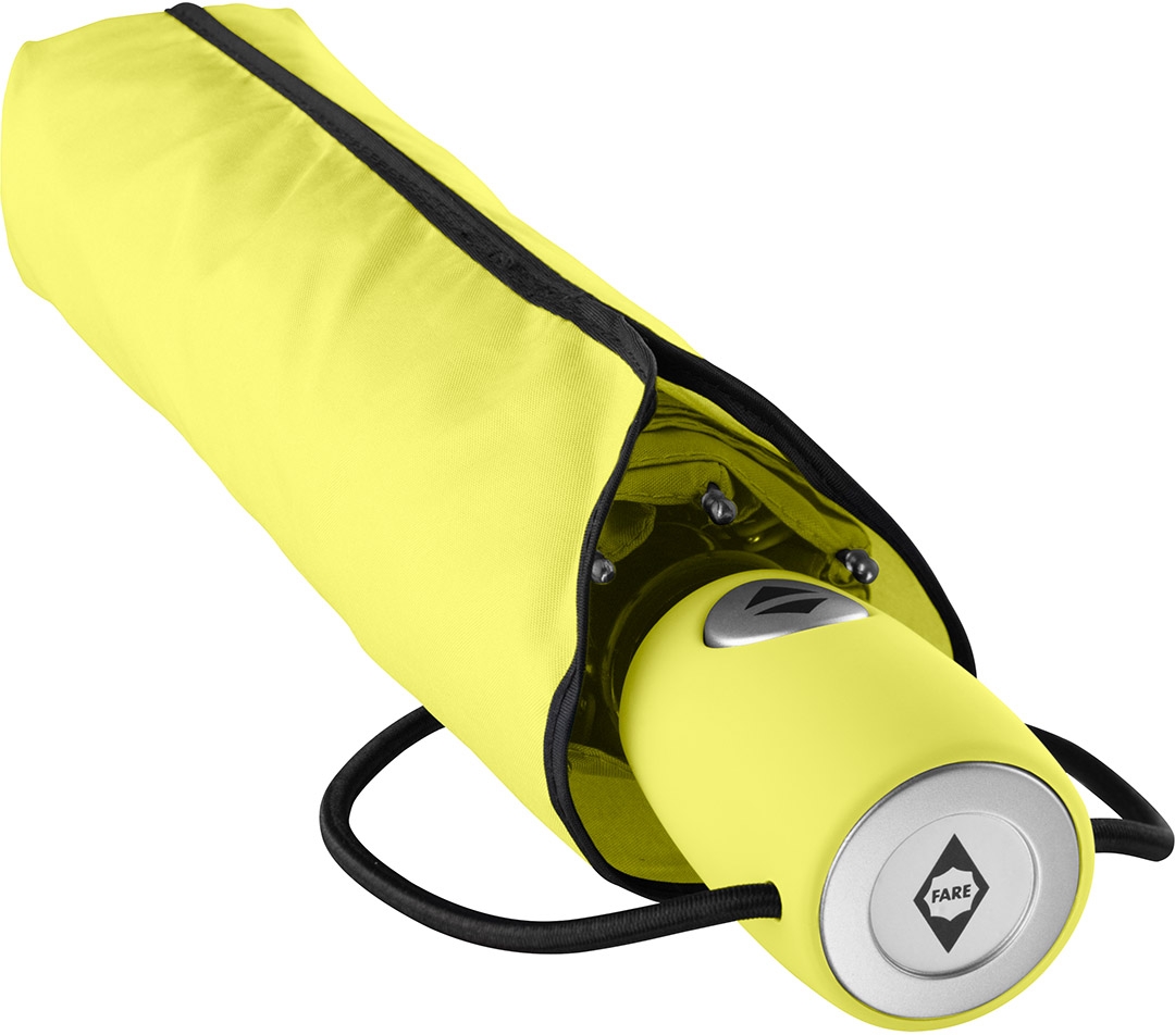 Convenient automatic open/close function for quick opening and closing, high-quality Windproof PLUS system for maximum frame flexibility in stormy conditions, depending on the colour, also available with waterSAVE® label on the closing strap (with new deliveries), chromed steel shaft, Soft-Touch handle in colour matching cover with silver push-button, elastic loop and promotional labelling option, sleeve with black piping. Also available as another mini pocket umbrella (art. 5565), as regular umbrella (art. 7560) and golf umbrella (art. 7580).